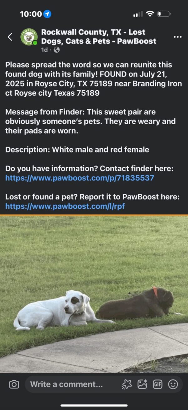Date found: 08/02/2025 Location found: Heath, TXSex: FemaleDescription: Sweet girl puppy found, brown and white coloring. One blue eye and one brown eye. Found with her brother. Found By: Misty…