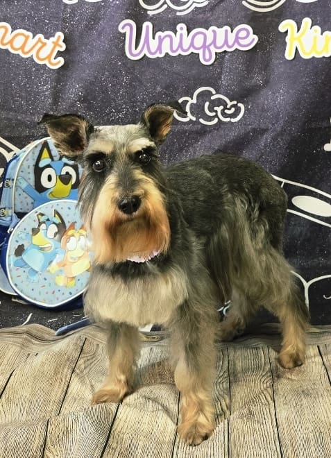 16 year old miniature schnauzer, gray and white in color, thin. She is deaf and has poor vision. She is very docile and will not bite. She has a large wart on her left shoulder.
