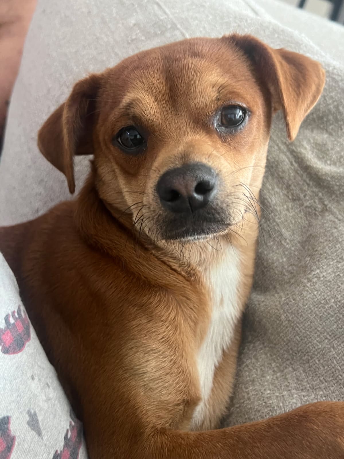 He is a small/medium male with mainly brown fur with black mouth and a white chest fur with floppy ears and brown eyes